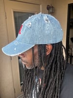 This exclusive rare one of one denim sample dad cap was aged and then destroyed to give you the look ., A timeless piece of i may say
